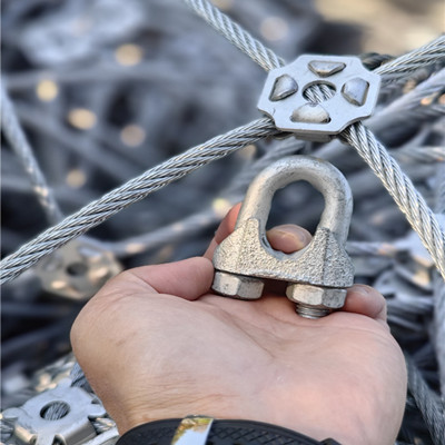 落石防护网卡扣缝合绳的直径应为Φ8钢丝绳,每张钢丝绳网宜用一根缝合绳缝合,其长度按能实现网与周边支撑绳或临近网边缘缝合来确定,每根缝合绳两端各用2个Φ8绳卡固定。