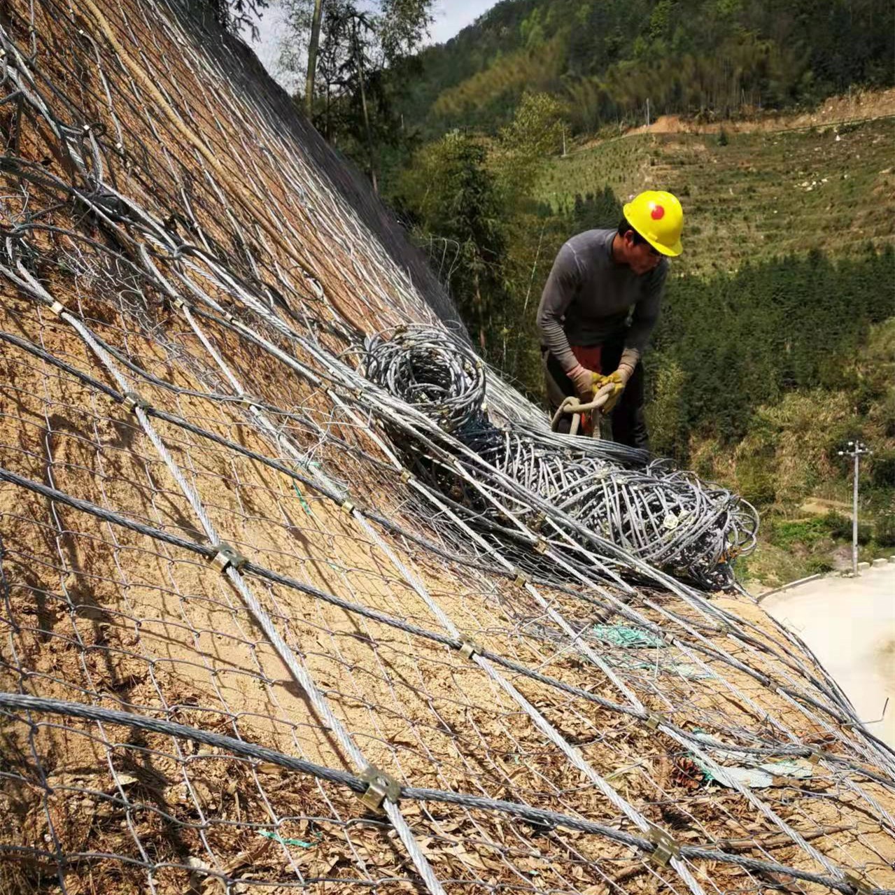 以系统尽可能的紧贴坡面,局部区域根据需求可增补固定锚杆,增补锚杆长度为3m,锚杆孔应尽可能的与坡面垂直。安装支撑绳:纵横支撑绳均穿过沿程钢丝绳锚杆的环套,并用紧线葫芦张拉至手感不再松动为止,两端用绳卡固定。为避免支撑绳张拉困难,对纵横向尺寸较大的坡面,每根支撑绳可按30m左右分段。