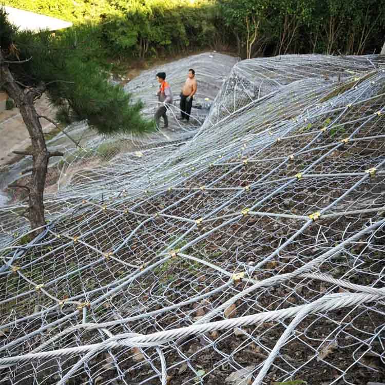 主动边坡防护网在山体滑坡和山体结实方面的作用:主动防护系统用各种柔性网(主要是钢丝绳网)掩盖待防护的斜坡或岩石,以限制斜坡上岩土的风化、剥落或毁坏以及危岩的坍塌(加固),或控制一定范围内落石的挪动(围封)。维护行人和车辆平安经过!