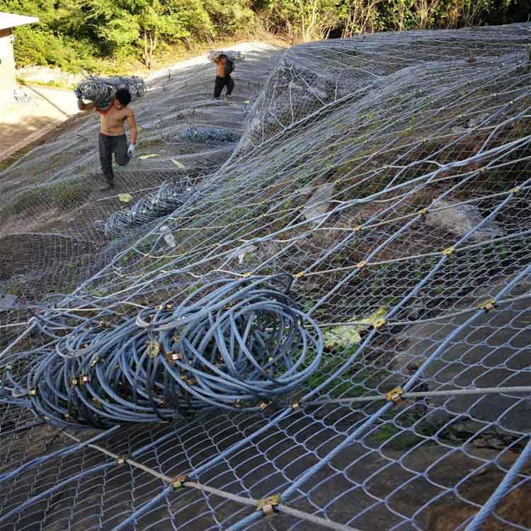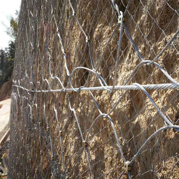 2、若单张钢丝绳网在不超过三个网孔的范围内有两根以上的断丝、影响其强度的严重扭曲现象或不超出三点以上的断绳现象,则可以用至少相同规格的钢丝绳段按交叉或环绕方式予以修补,该绳段的交叉点和端点应用绳卡紧固;若损伤现象超过了上述程度,则就考虑更换该张钢丝绳网。