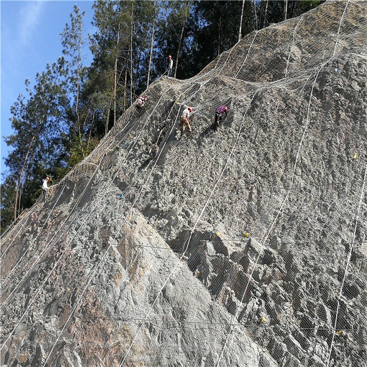 缝合绳:8mm钢丝绳,内外网与支撑绳缝合在一起,结合柔性螺栓形成全体网面,对边坡、地道、山体、基坑等进行强有力的保护。边坡防护网具有灵活性高、耐腐蚀、抗拉强度高、使用寿命长等优点。