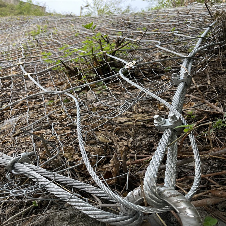 构造配备:边缘(或上沿)钢丝绳锚索+支撑绳+手术缝合绳[DO/08/300钢丝绳网+左右沿钢筋锚固+左右沿(或横着)支撑绳]