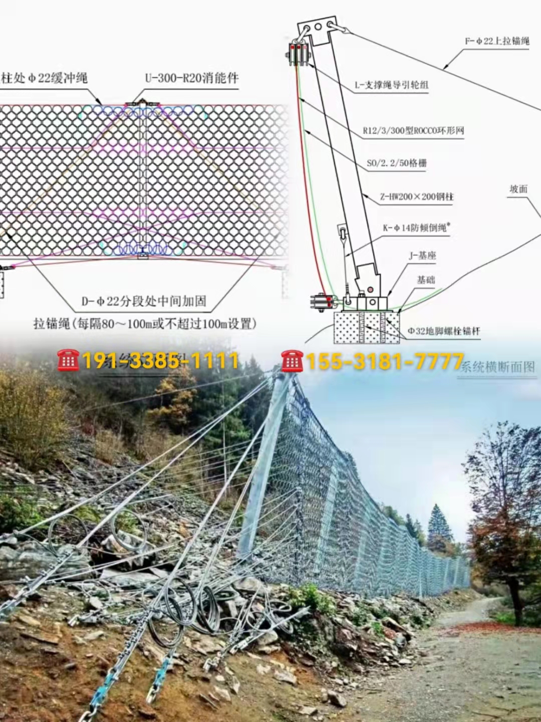 安装边坡防护网钢柱和拉锚绳,安装支撑绳安装支绳时先安装上支撑绳,其次下支撑绳。