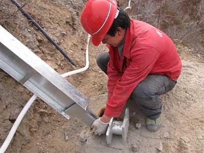 (1)按设计并结合现场实际地形对钢柱和锚杆基础进行测量定位。现场放线长度应比设计系统长度增加约3~8%,对地形起伏较大,系统布置难沿同一等高线呈直线布置时取上限(8%);对地形较平整规则,系统布置能基本上在同一等高线沿直线布置时取下限(3%);在此基础上,柱间距可有为设计间距20%的缩短或加宽调整范围。