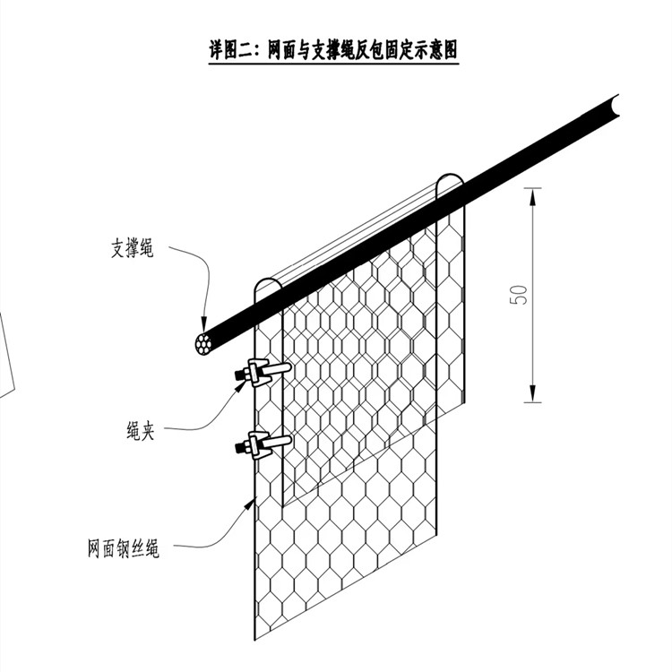 STC-50型主动防护网采用直径2.7mm的钢丝及直径8mm的钢丝绳以双绞合的形式共同编成而成的六边形网孔复合柔性金属网。网面加筋钢丝绳与钢丝同步编织而成,加筋间距50cm。