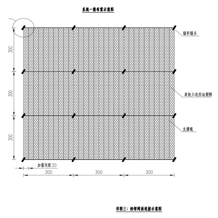 在坡面均匀布置一系统锚杆,相邻锚杆的水平及竖向间距一般为3m,此处坡面凹凸不平,锚杆布置时可适量调整,尽量将锚杆布置于坡面低凹处,在坡顶的一排锚杆上安装上支撑钢丝绳,用于固定Steelgrid高强加筋网;坡顶处,网面折叠反包并固定在上支撑绳上,网面在自重作用下自然垂挂于坡面;在坡面其它锚杆上按照设计的形式穿插并张拉支撑绳,用于将网面紧压在坡面上,以获得稳定的加固性能。